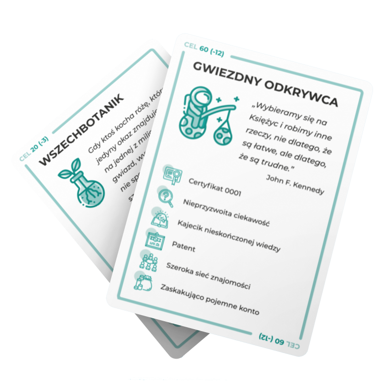 po 1 sztuce każdej Karty Celu + 20 szt “pustej” Karty Celów. Łącznie 40 sztuk.